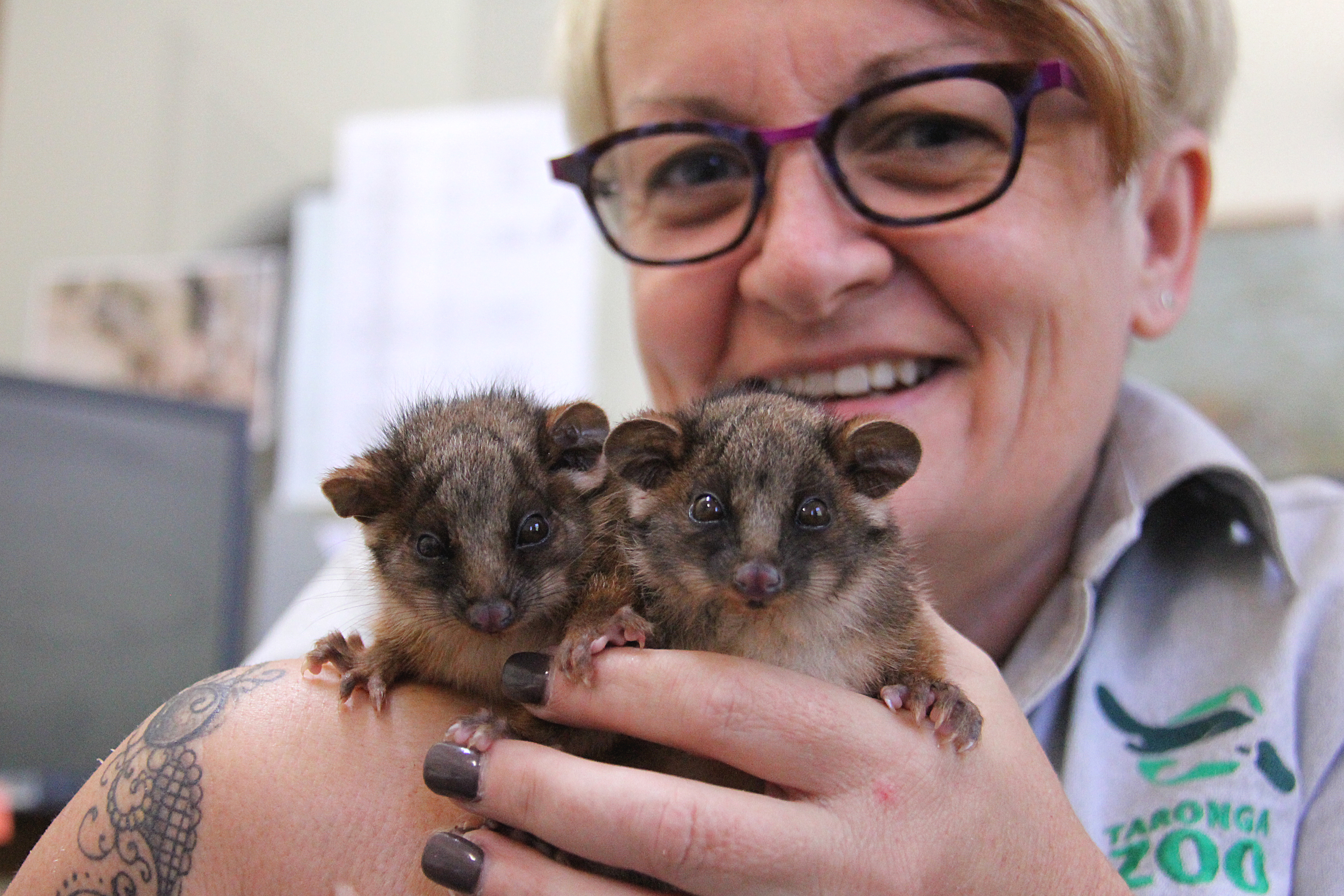 Taronga staffer Di Scott is providing round-the-clock care to the twin brothers, carrying a makeshift pouch and waking at 3am to feed and toilet the joeys.