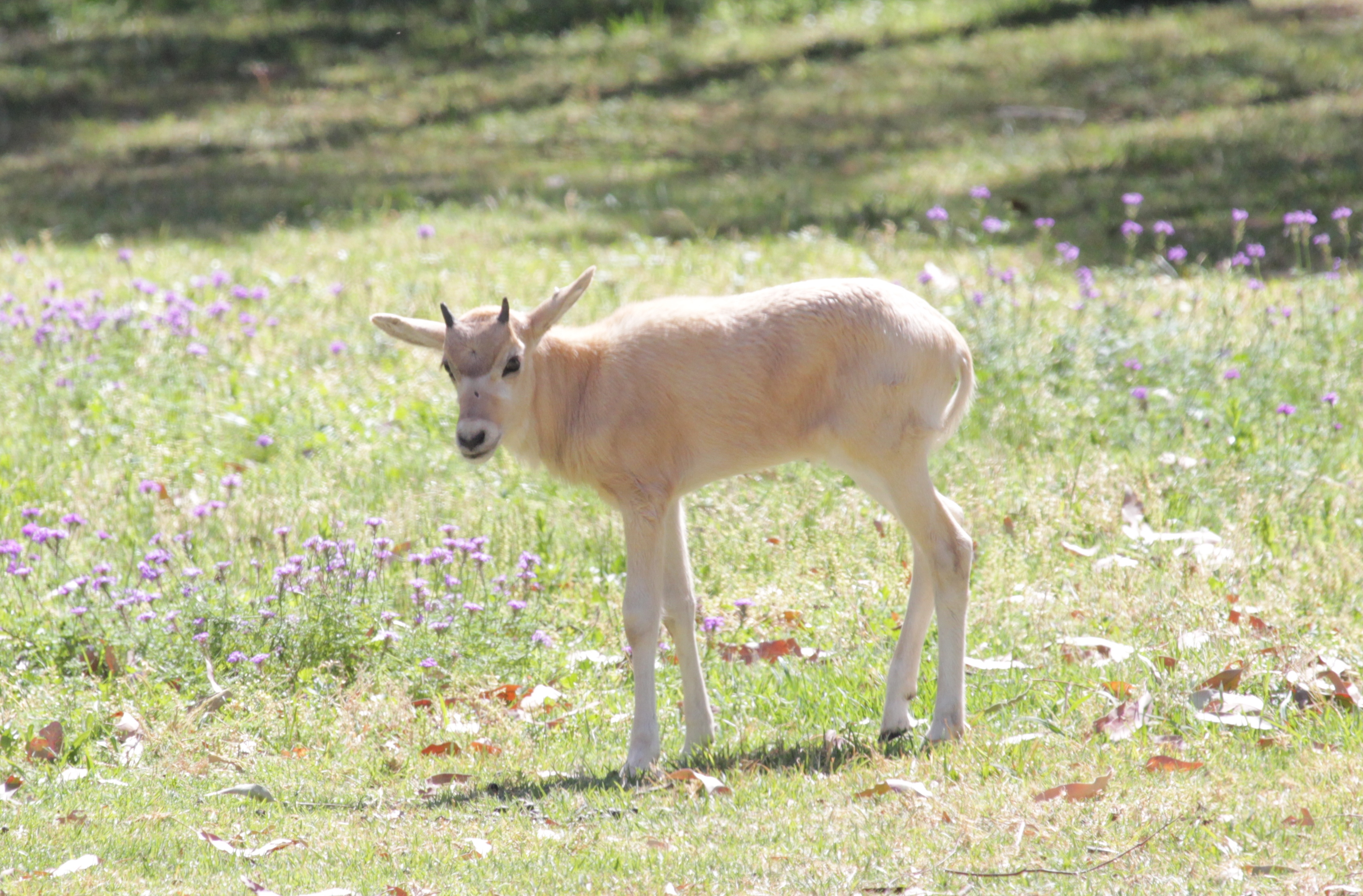 Taronga Western Plains Zoo has welcomed a female Addax calf to the herd on 15 September 2014. This is the first calf for mother Tibbutoo, who is displaying all the right maternal behaviours in caring for her calf. This birth is quite significant, not only does it boost the population of this critically endangered species at Taronga Western Plains Zoo, but because this is the first calf for Tibbutoo it has expanded the genetic diversity in the herd as well. For the first couple of weeks of its life, Tibutoo has stashed the calf in the longer grass or behind a log on exhibit. This is a natural behaviour that Addax do in the wild to protect their young from predators, and recently it has started to be seen more with the Zoo herd.There are now 11 Addax in the exhibit herd, which has grown dramatically over the past two years with six calves being born during this time.