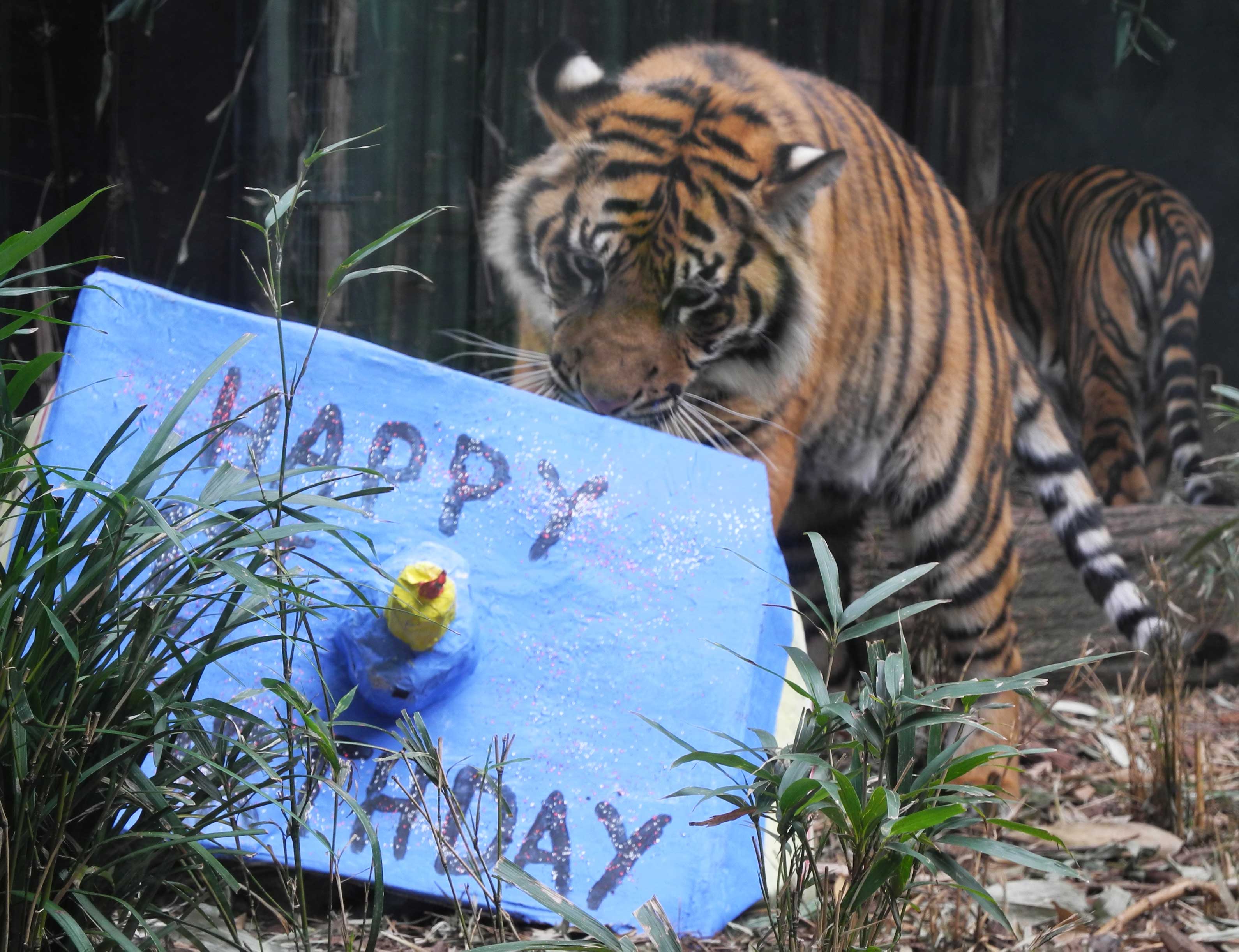 The 27th of August marked the first birthday of Taronga’s three tiger cubs, Kembali, Sakti, and their sister Kartika. The three Sumatran Tigers were born to mother ‘Jumilah’ and father ‘Satu’, which added three precious additions to the critically endangered Sumatran Tiger population.To celebrate this 12 month milestone, their keepers designed a special set of enrichment activities, which had the cubs looking for tasty treats that were disguised in presents made of colourful cardboard boxes. The playful cubs demonstrated their amazing hunting abilities tearing apart the boxes to get to their food. At the age of one, the tigers are well on their way to adulthood and are becoming increasingly independent, so when it came to enjoying their surprise they weren’t scared to wrestle over their favourite boxes! Taronga’s Carnivore Keepers say that the cubs have lost their baby teeth and are growing their adult canines, and along with maturity, they have become less dependant on their mother, Jumilah, who Carnivore Supervisor, Louise Ginman describes as: “The most wonderful mother who has reared the cubs to perfection”.The birth of the three cubs was a long anticipated event, with mother Jumilah, amongst the last litter of Sumatran Tigers born at Taronga Zoo in 2003.. When paired with ‘Satu’, a male tiger from Germany, the pair didn’t immediately hit it off, but after two years of attempted matings, Jumilah successfully gave birth to her three healthy offspring. The cubs each have very distinct personalities, which makes it easier for our keepers to tell them apart: Sakti is young male who loves his food and is always checking in to see if his mother has any leftover snacks; his brother Kembali is a playful character who is often lying on his back with his feet in the air; and Kartika, the boldest of the three, shows off her curious nature by exploring every inch of the exhibit. The cubs, who have been taught their names from a young age, are a joy for the keepers and importantly represent the future hope of their species. It is estimated that only 300 - 400 Sumatran Tigers are left in the wild, as the species continues to be affected by poaching and habitat destruction in Indonesian forests for unsustainable palm oil plantations. The success of the breeding program has meant that an increasing number of people have learnt about the Sumatran Tiger species and are more aware about the threats that the species faces. Over the last 12 months, the keepers have been very excited by the number of people they’ve been able to talk to about Sumatran Tiger protection. They even made a video which plays at the tiger exhibit so visitors can find out how they can help... and it’s as simple as being aware what’s in your shopping trolley! Many products, from confectionary to body lotions sold in Australia contain palm oil, which is having a deadly affect on tigers.With such an important 12 month milestone reached, we have high hopes that Kembali, Sakti and Kartika will, in the future have offspring of their own, and further boost the Sumatran Tiger population across the world.If you’d like to see the tigers at Taronga, come along to our keeper talk at 2:15pm every day, and watch these tigers enjoy their meal while you learn more about them, from the people that know them best, their keepers!