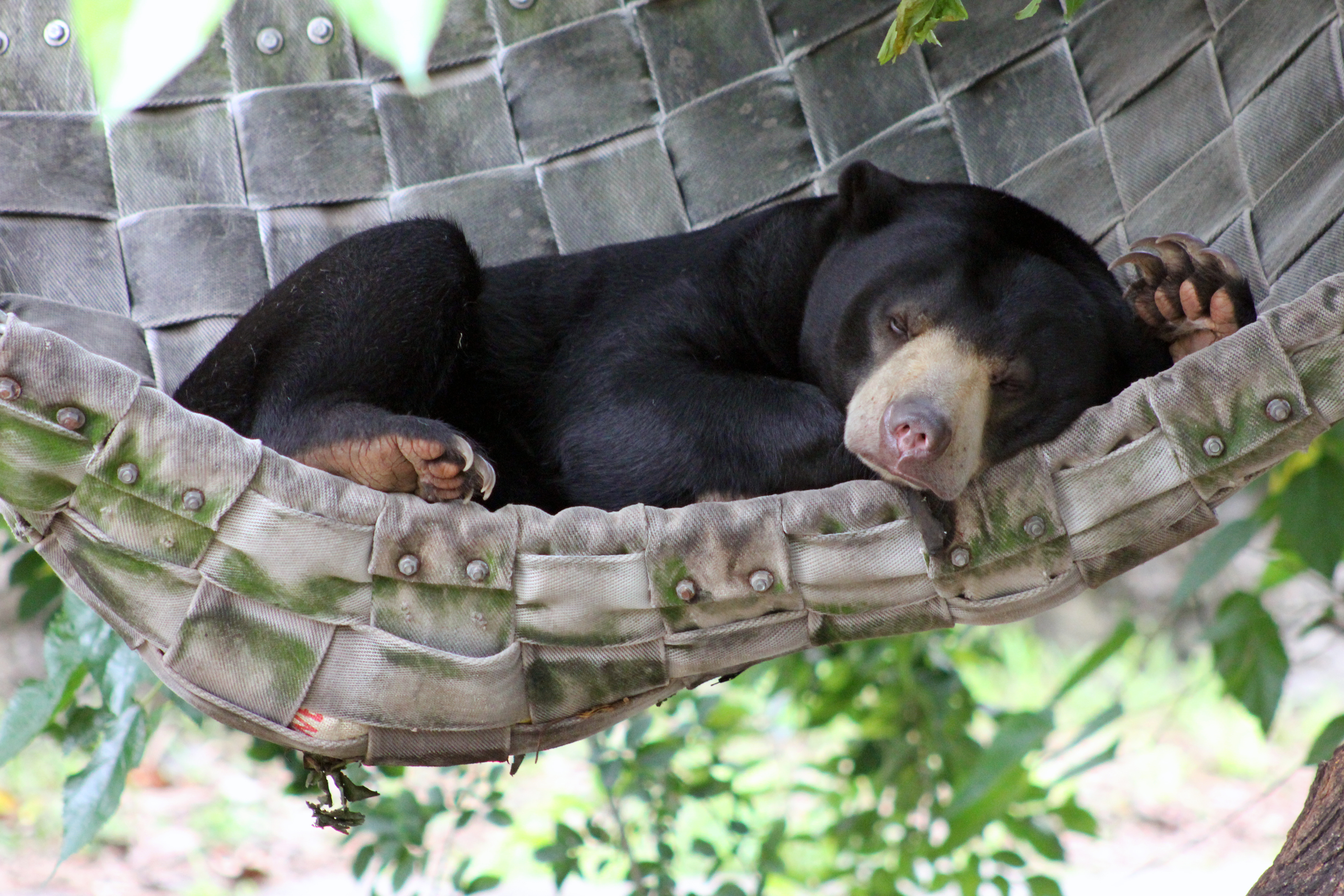 With enrichment a sense of control is offered to the animal by providing choice with opportunities to climb, scratch, dig, sniff, tear, chew, smell scents, problem solve and more. Sun Bears don’t hibernate like some other bear species but they do make nests in trees to sleep and to stay away from predators at night. Mr Hobbs is given everything he needs to make a cosy night nest, “He builds a lovely nest each night,” shares Lesley, “but he also loves finding his food in challenging ways.”