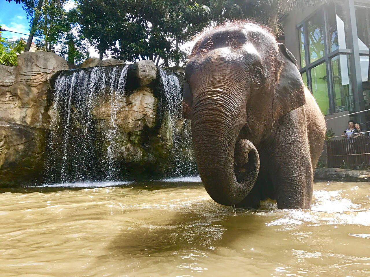 On this particular day all three elephants were eager to enter the pool and play in the waterfall as the temperature continued to rise throughout the morning. The elephant keepers enjoyed interacting with the elephants, and didn’t mind occasionally getting splashed in the process, while throwing in treats as added enrichment.