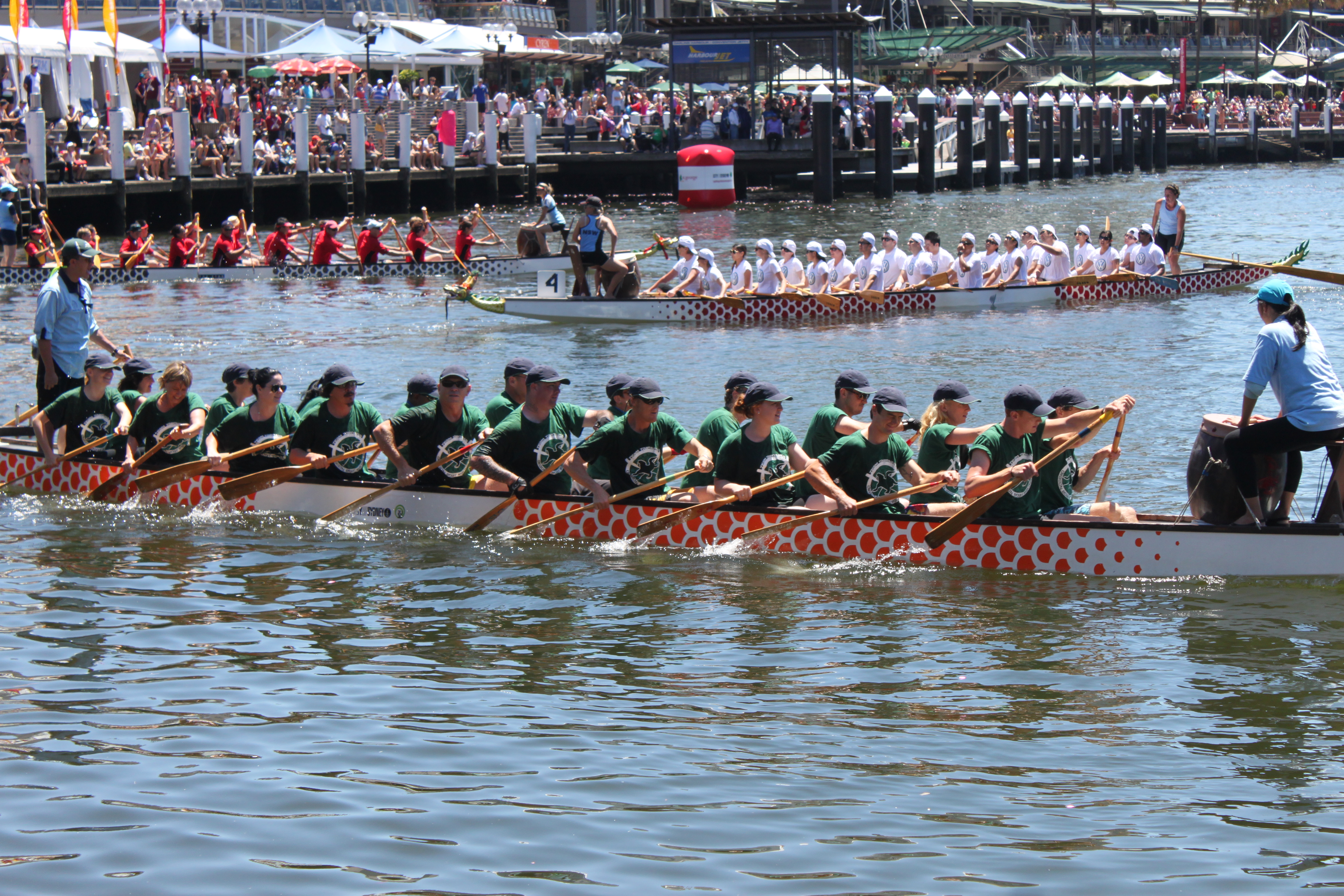 Bleary-eyed at 6:30am on a Sunday morning, the Flying Komodos began to build their force on the water’s edge of Darling Harbour in what was going to be a very big day of Dragon Boat racing.The Flying Komodos aka Team Taronga featuring 10 male and 10 female staff members plus two reserves, had been training hard alongside the Sydney Fish Markets at Pyrmont thanks to the expert assistance of the FFB Dragon Boat Club. A Special mention has to go to FFB’s Jenny, Anthony and Brian who moulded us into the best dragon boat team we could be in what was a very short training program.From all areas of Taronga, staff came together to learn paddling technique, timing and a start formula sure to contend with any other competitors in the corporate and community race day at Cockle Bay, Darling Harbour. We were paddling to support the Komodo Dragon and the Taronga Foundation which is the official charity partner of the City of Sydney’s Chinese New Year Festival.Our first race, with very little warm up, highlighted that under the pressure of racing conditions our timing was off in what we later learnt was called the ‘caterpillar’, where a gentle ripple of paddles moving up and down travelled from the front to the back of the boat. The key to dragon boat racing is a team who are perfectly in time in order to push the, pencil thin, 200kg + boat forward. We now knew that this needed to be streamlined for our remaining races so an alternative start was devised. Saying this we still placed third in lane 6 which is one of the slower lanes overall. In Race Two we competed against some very strong teams which had months of training and a very competitive edge. We pushed through the 250m race to place fourth overall with the slight mishap of another boat steering into our lane. Thanks to our fabulous sweep Anthony we managed to avoid colliding but this affected our pace. For those not in the know, a ‘sweep’ stands on the back of the boat with a big oar to make sure we travel in a straight line!Our third and final race for the day was the Sponsors Challenge, known for its rivalry among sponsors of the Chinese New Year Festival and Dragon Boat event. Again, we were placed in lane six on the western side of Cockle Bay. With our start combination streamlined and a team that was in time stroke for stroke, we planed ahead of the other teams, parting the glassy surface on one of Sydney’s rare sunny summer days. Fatigue took a back seat and there was no sign of slowing as the Flying Komodos passed the finish line in a clear first to the ecstatic excitement of all on board and the cheer squad on the quayside.The day wouldn’t have been possible without the coordination of team captain, Owen, who ensured we didn’t miss a training session or race. He proudly accepted our winning trophy at the presentation ceremony concluding a day that made the Flying Komodos the talk of the regatta.