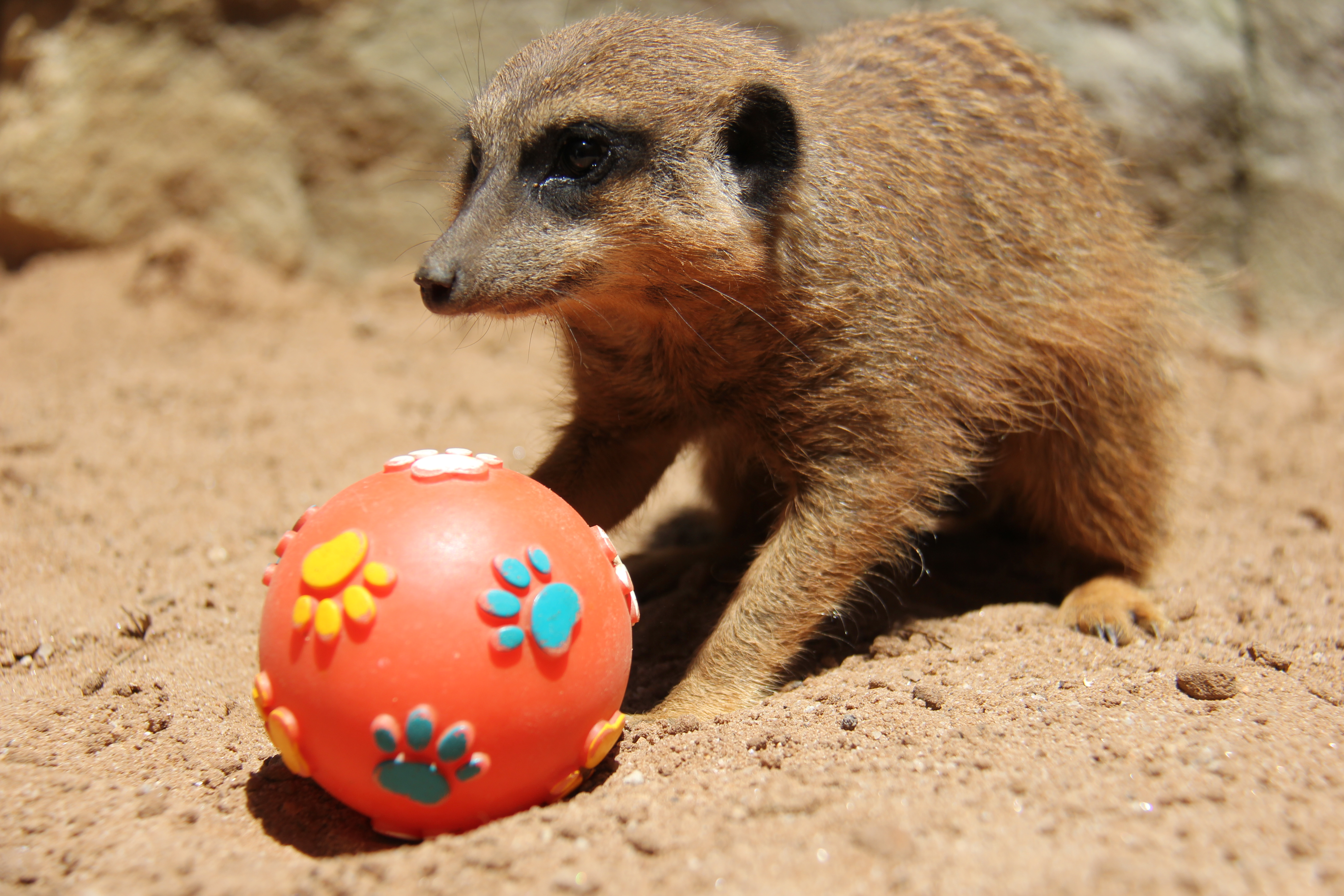 Other enrichment items we use each day include, treat balls filled with meal worms, insect feeders, paper bags, cardboard boxes and toys which provide fun, entertainment and challenges for the Meerkats. We use different items each day to create unique challenges to stimulate both physical and mental activity.